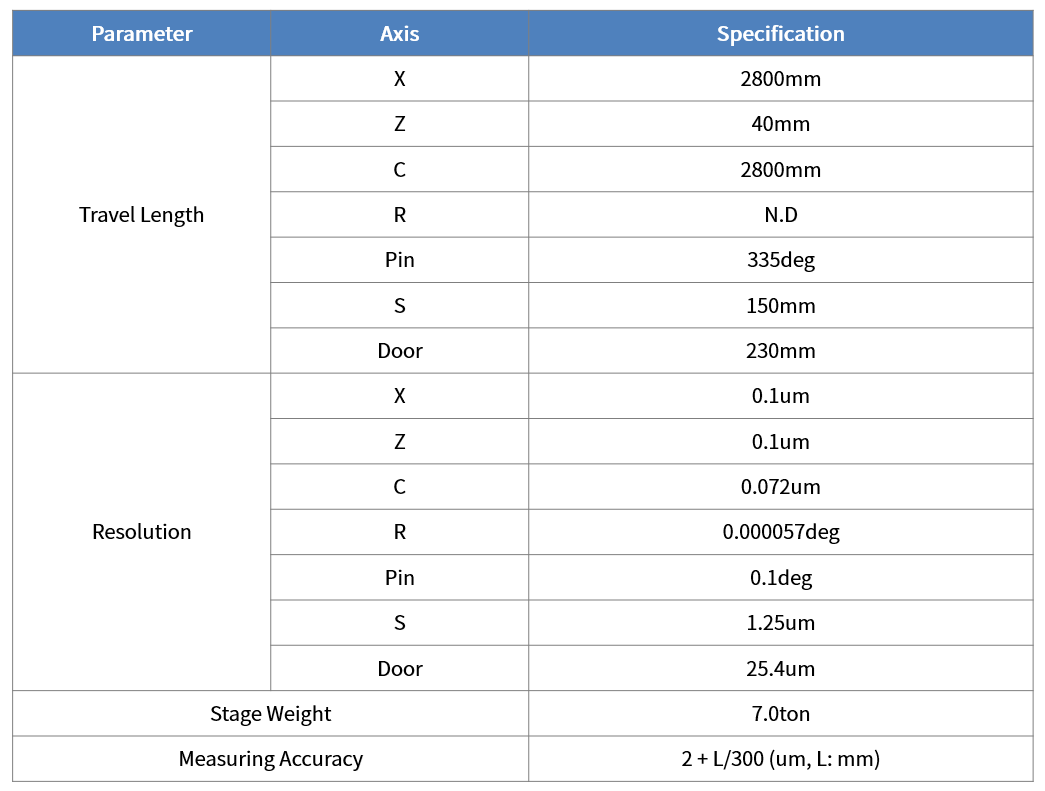 設備參數 ?- 可測量螺桿長度 : 500~2800mm - ?激光尺寸誤差 : 1ppm ?- 測量精度 : 2 + L/300 (um, L : mm) ?- 根據客戶要求定制